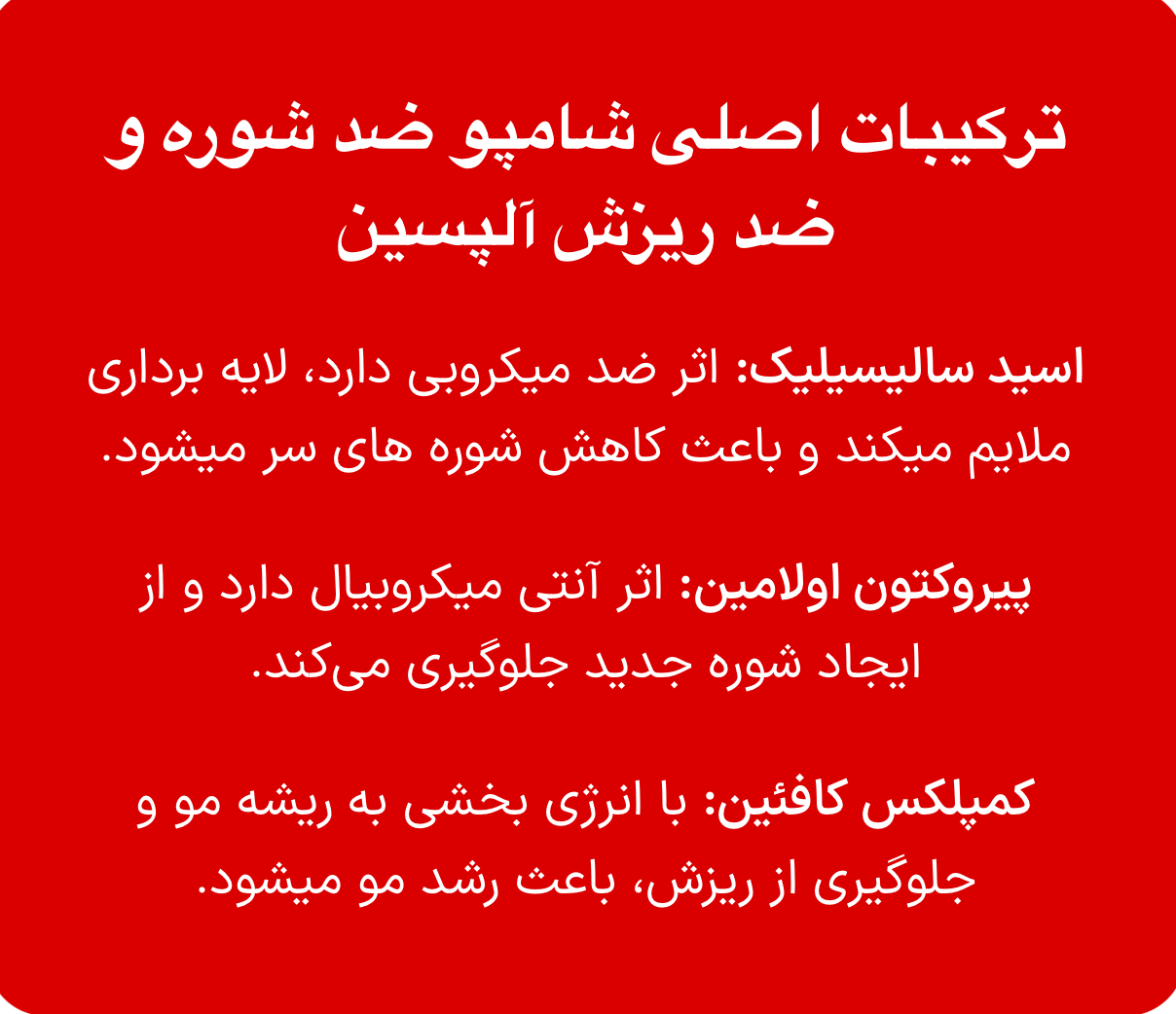 ✅اسید سالیسیلیک و پیروکتون اولامین تاکنون منحصراً در محصولات داروسازی به عنوان محلول ضد شوره استفاده میشد. این ترکیبات باعث لایه برداری ملایم پوسته های سر میشود و خارش پوست سر را برطرف میکند.
